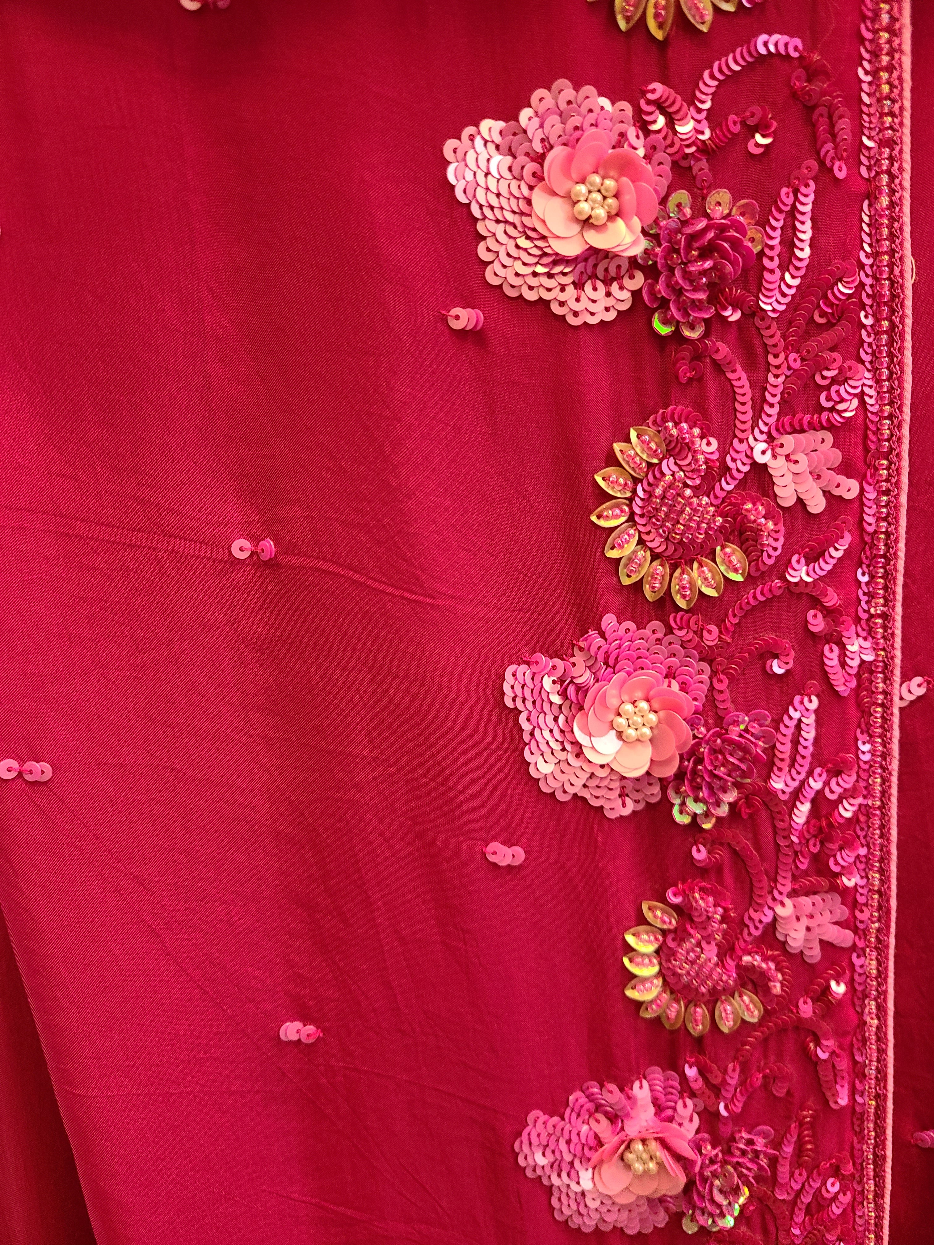 Make a bold and beautiful statement with this stunning magenta embellished saree, a perfect fusion of vibrant color and exquisite floral artistry. This gorgeous designer saree features intricate embroidery work that creates a captivating visual appeal, making it ideal for celebrations where you want to stand out with grace and confidence.