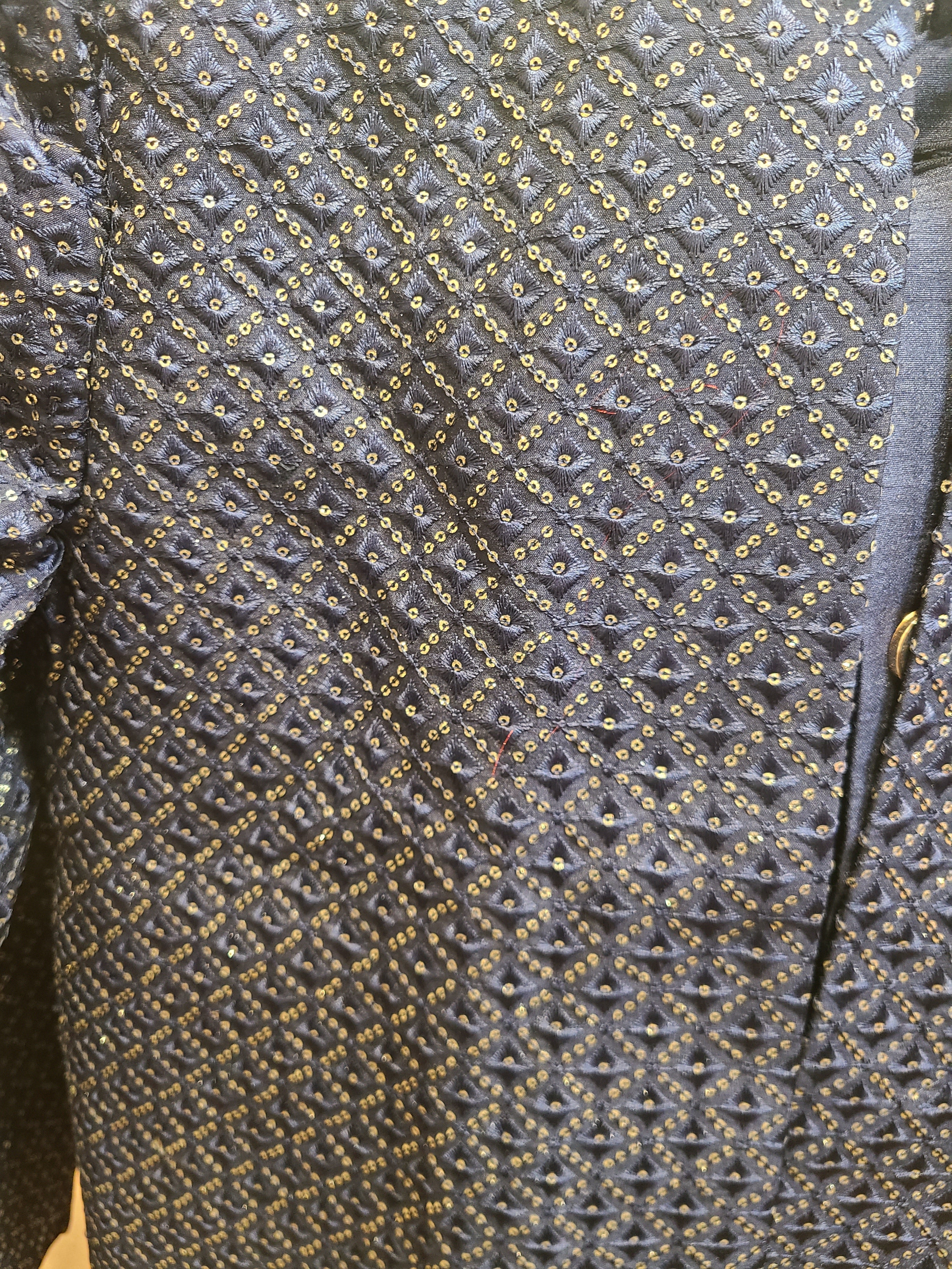 - Sherwani: Midnight blue long sherwani with intricate sequin embellishments throughout creating a textured, shimmering effect