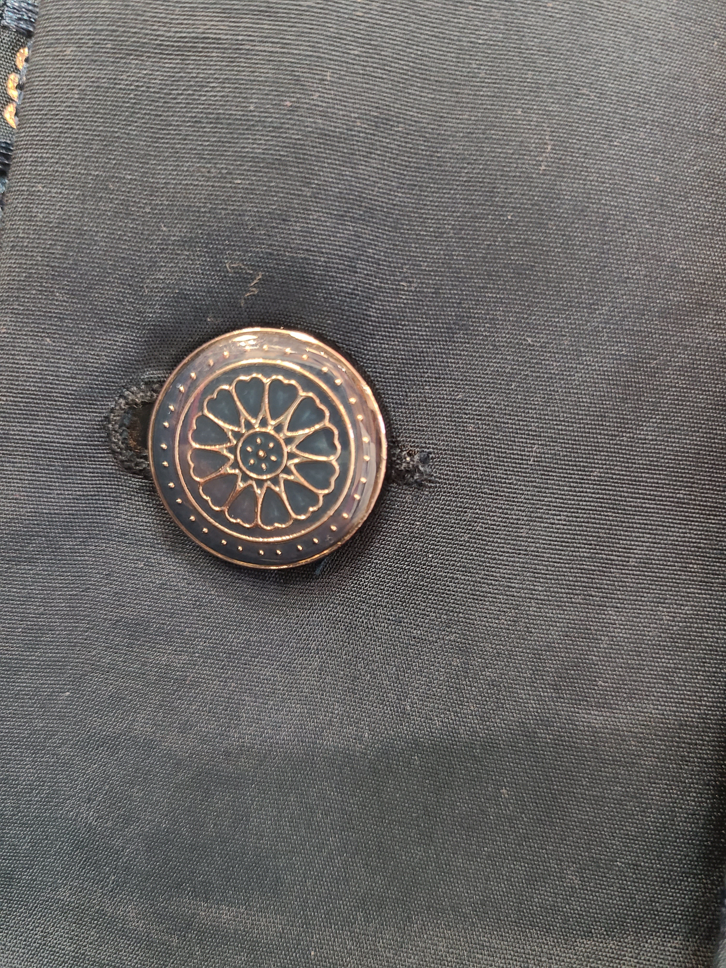 - Band Collar with Button Detailing: Sophisticated mandarin collar with coordinating blue buttons that add a refined finishing touch