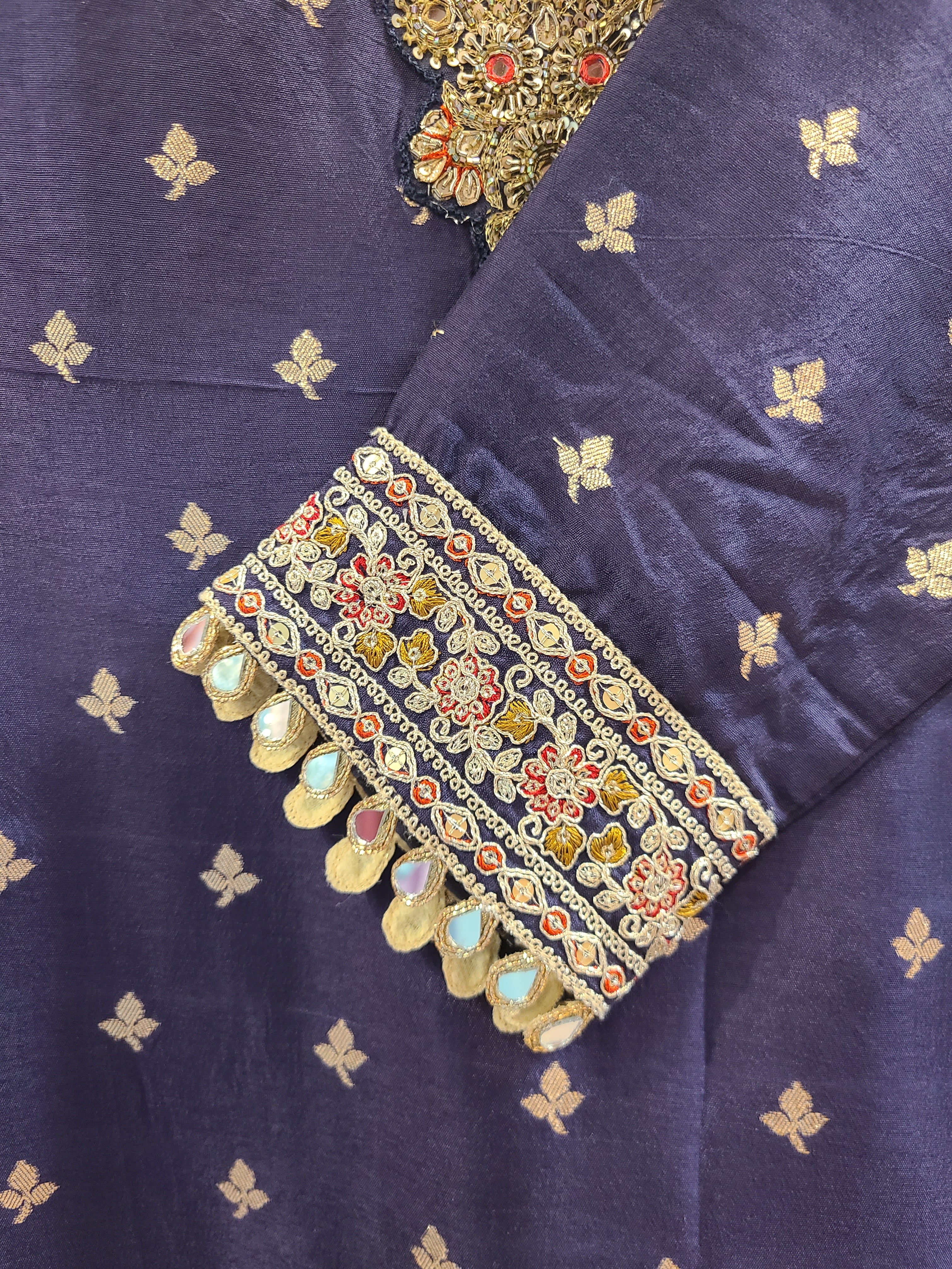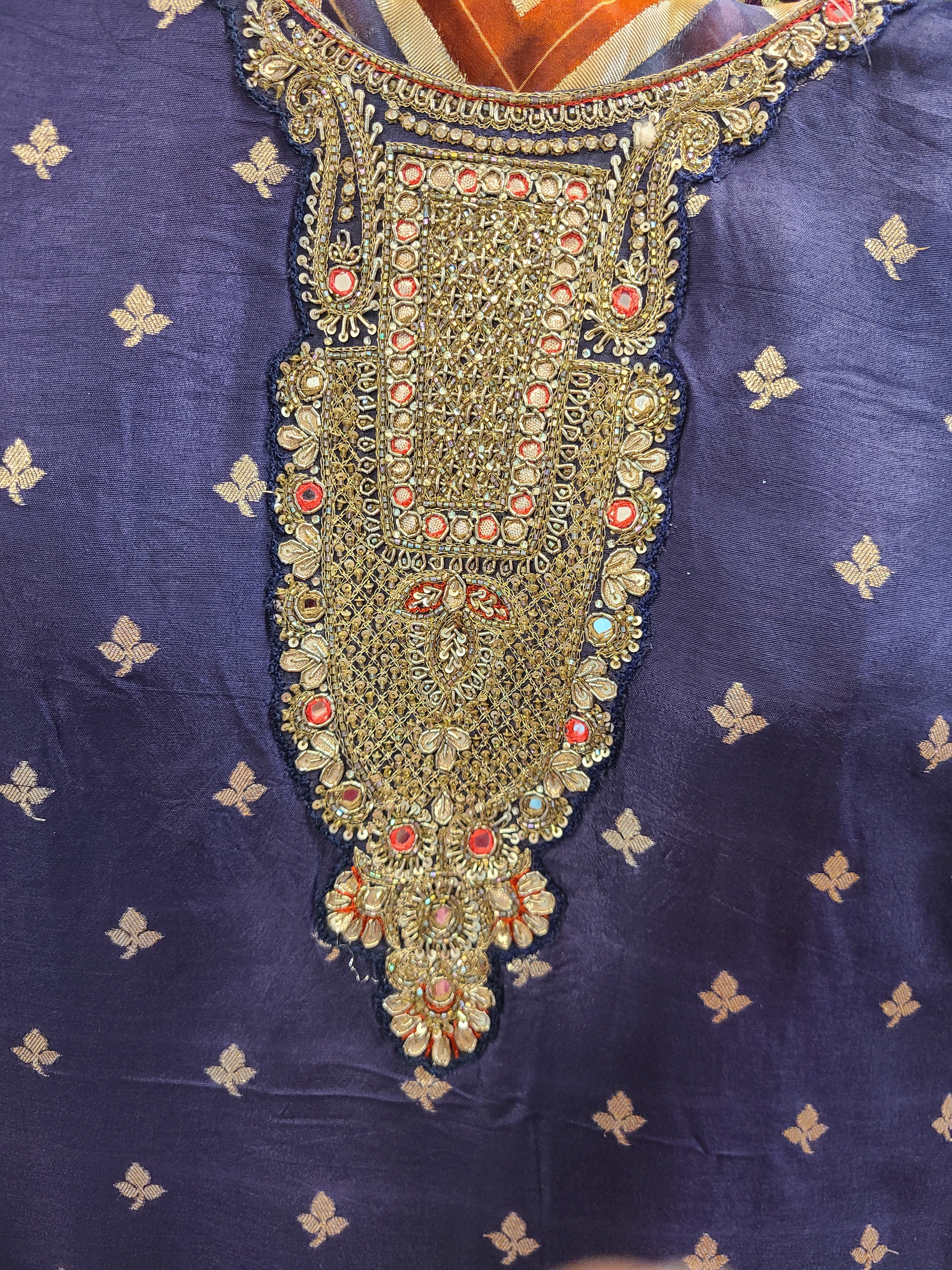 - Elegant gold embroidered neckline with intricate traditional motifs
