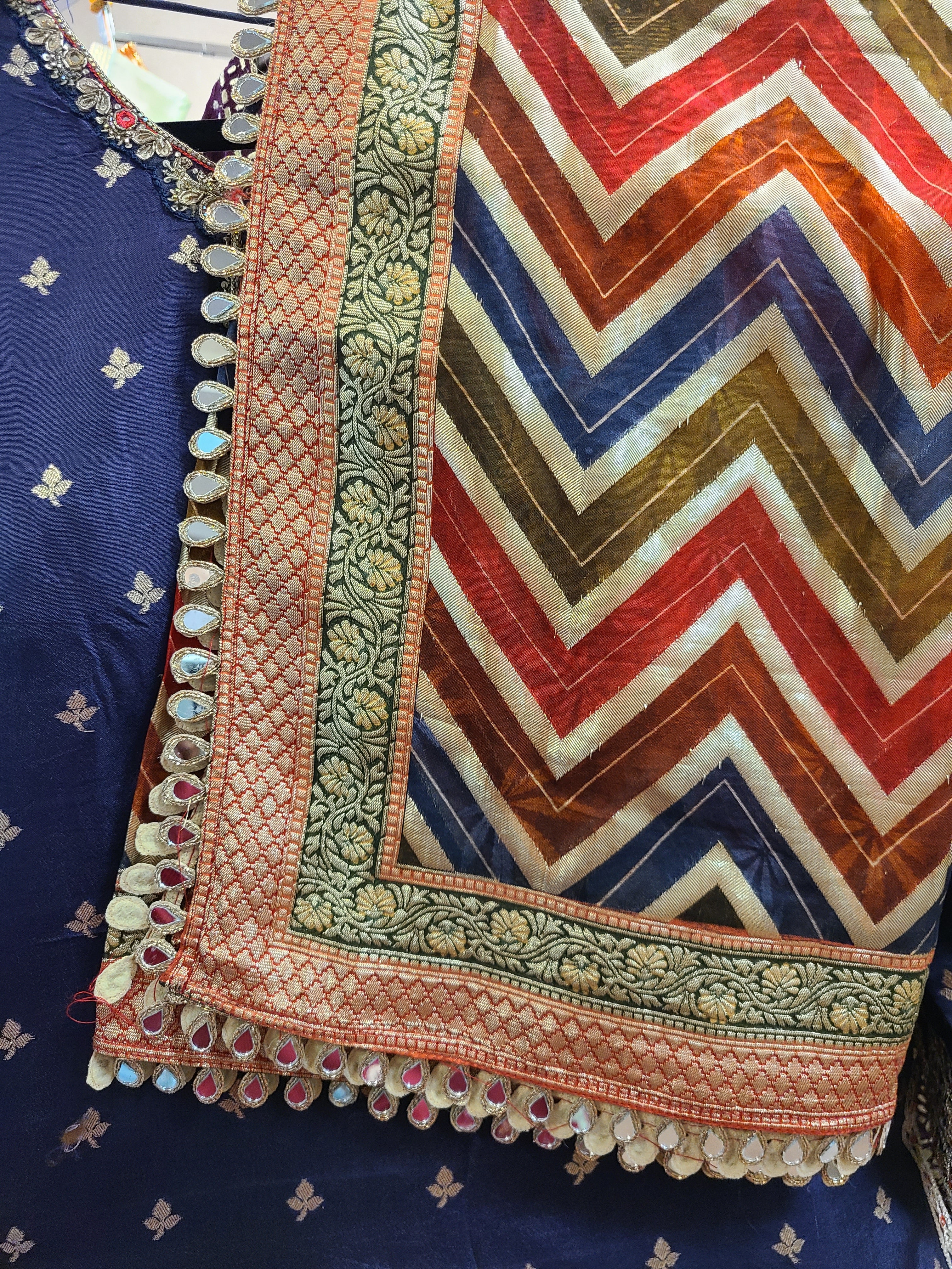 The deep navy blue creates a sophisticated, regal foundation that flatters all skin tones and photographs beautifully. The intricate gold embroidery adds opulence and traditional charm, while the multicolor chevron dupatta brings a fresh, modern twist that sets this ensemble apart. This is perfect for the bride or guest who wants to honor tradition while making a bold fashion statement.