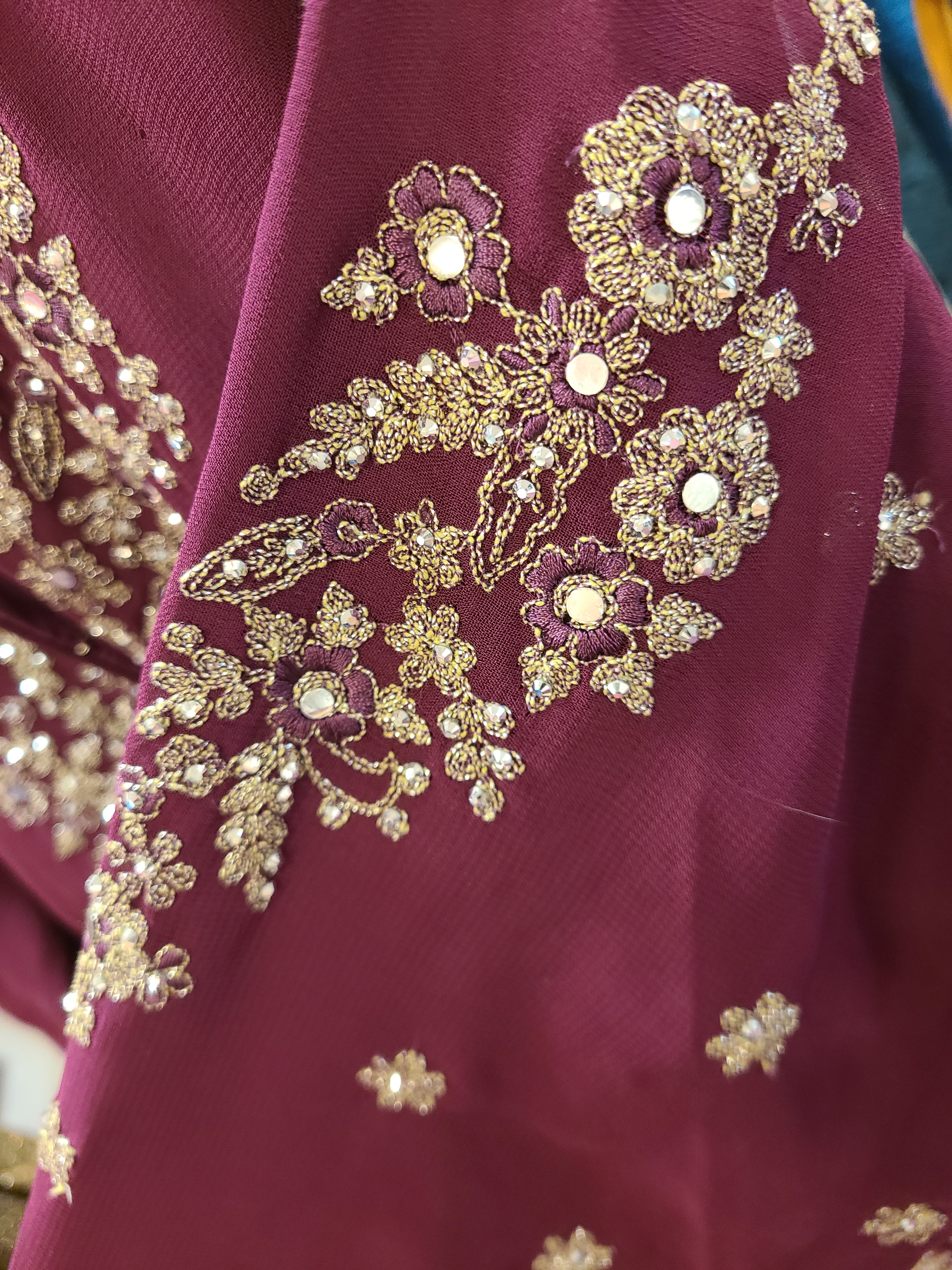 The rich burgundy hue exudes sophistication and royalty, while the intricate embroidery work showcases exceptional artistry. The vertical embroidered panels create an elongating effect, and the pleated sharara adds volume and drama to your look. The full-length sleeves feature delicate embellishments that complement the overall design.