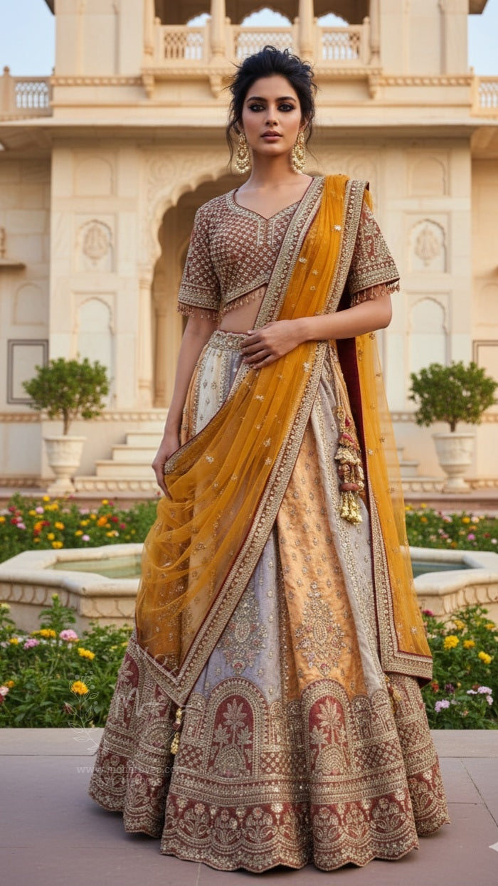 Inspired by the grandeur of Rajasthani palaces, this lehenga celebrates the rich heritage of Indian bridal couture. The unique color combination of ivory, mustard, and red represents purity, prosperity, and passion—making it perfect for your special day.