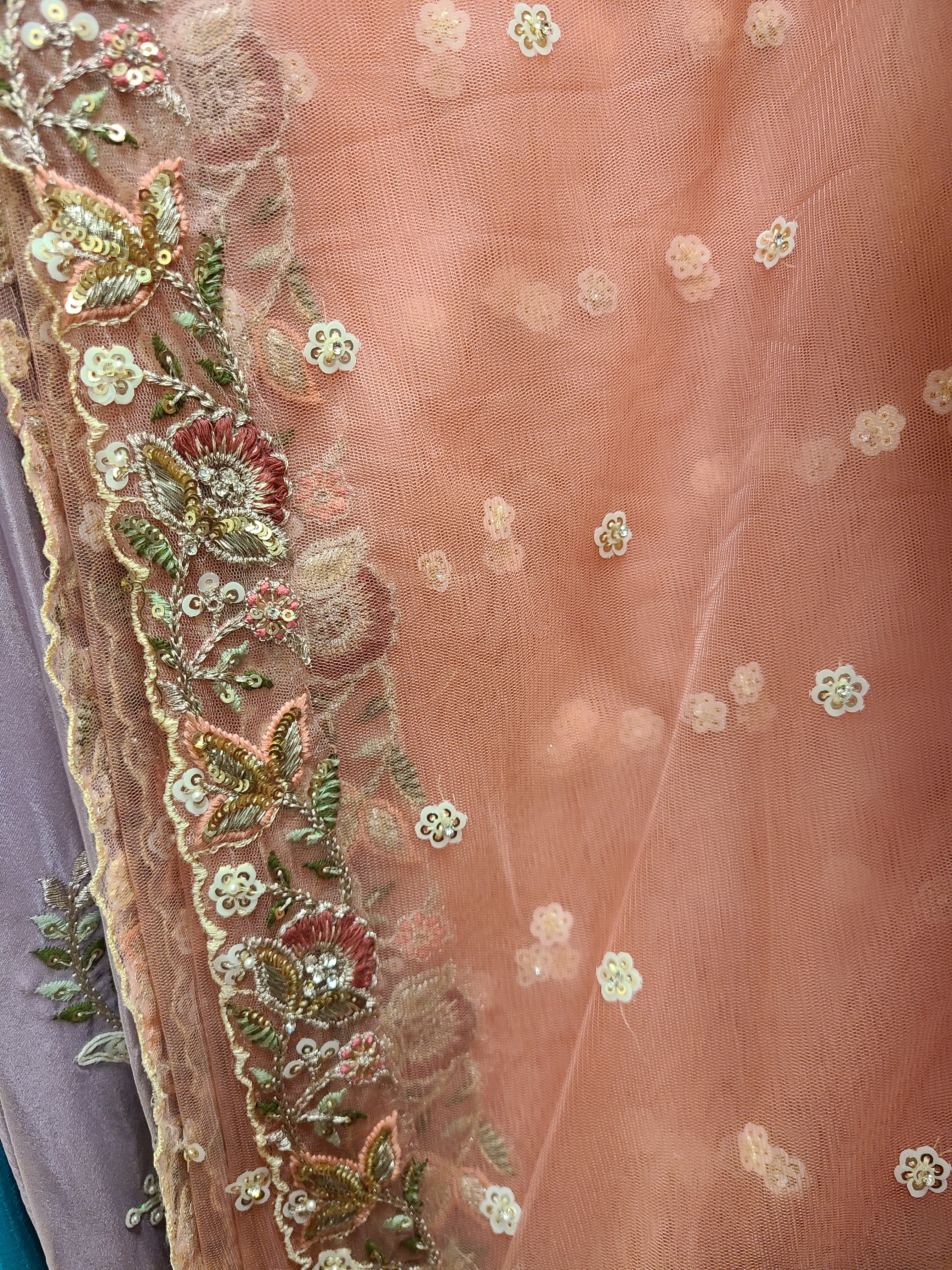 - Matching sheer pink-lavender dupatta with embroidered borders
