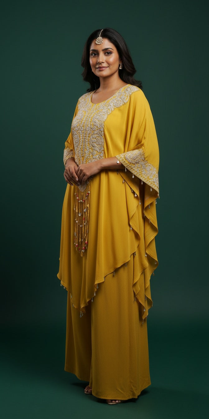 Embrace bohemian luxury with this stunning mustard yellow kaftan ensemble, a perfect fusion of comfort and sophistication. Featuring exquisite silver embroidery and flowing silhouette, this outfit is designed for the modern woman who values both style and ease. Perfect for festive celebrations, mehendi ceremonies, and special occasions.