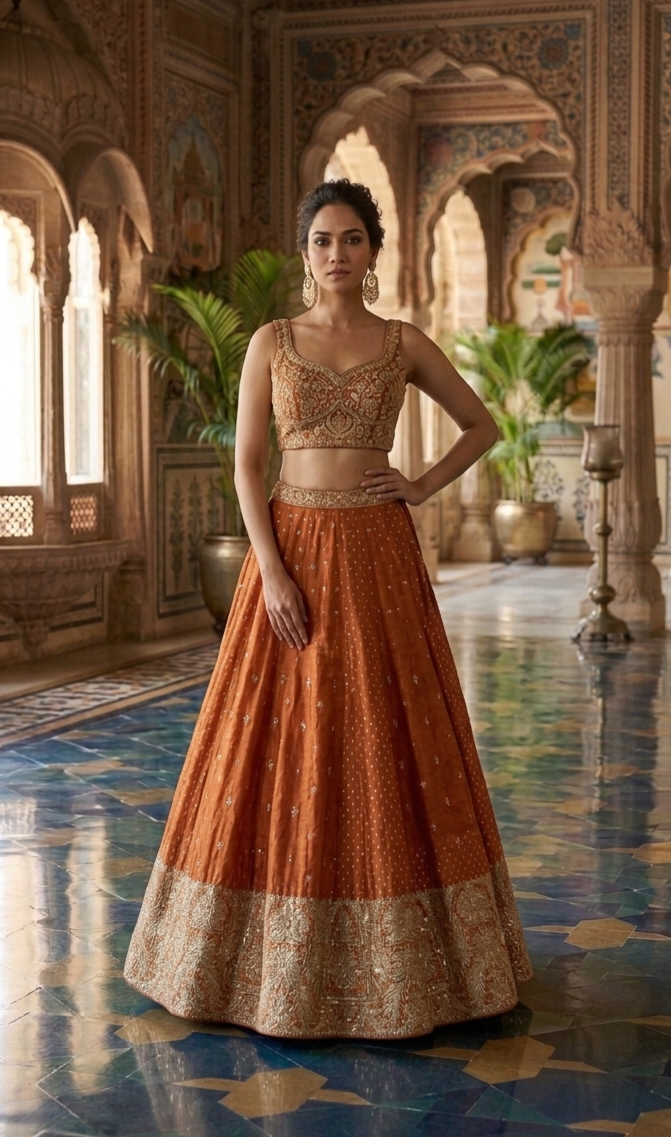 Draped in the warmth of royalty, this exquisite Orange Benarasi Silk Lehenga is a celebration of timeless Indian craftsmanship. The rich burnt-orange silk skirt features a voluminous pleated silhouette with a stunning wide gold zari border intricately woven with traditional floral and paisley motifs — a hallmark of authentic Benarasi artistry.