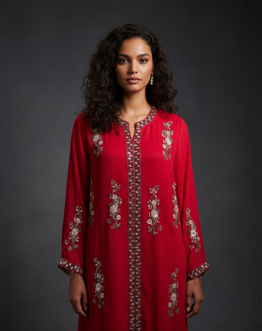 - Luxurious Embroidery: Intricate silver and gold embellishments adorn the neckline, sleeves, and hemline, creating a mesmerizing pattern that catches the light beautifully