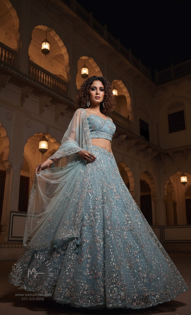 This powder blue lehenga is more than just an outfit—it's a celebration of your unique style, blending heritage craftsmanship with contemporary elegance. Step into the spotlight and create unforgettable memories.