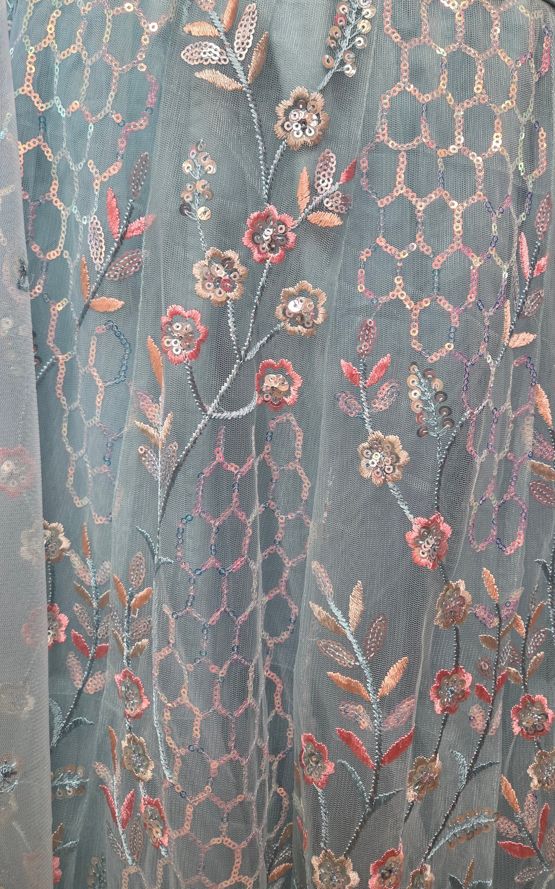 - Sheer Embroidered Dupatta: Ethereal net dupatta with scattered silver embellishments and embroidered borders for versatile draping
