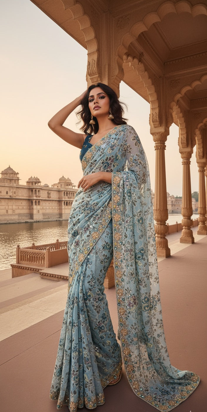 Embrace ethereal elegance with this breathtaking powder blue net saree that perfectly balances traditional sophistication with contemporary sparkle. This exquisite piece is designed for the modern woman who appreciates the timeless beauty of a saree with a touch of glamorous embellishment.