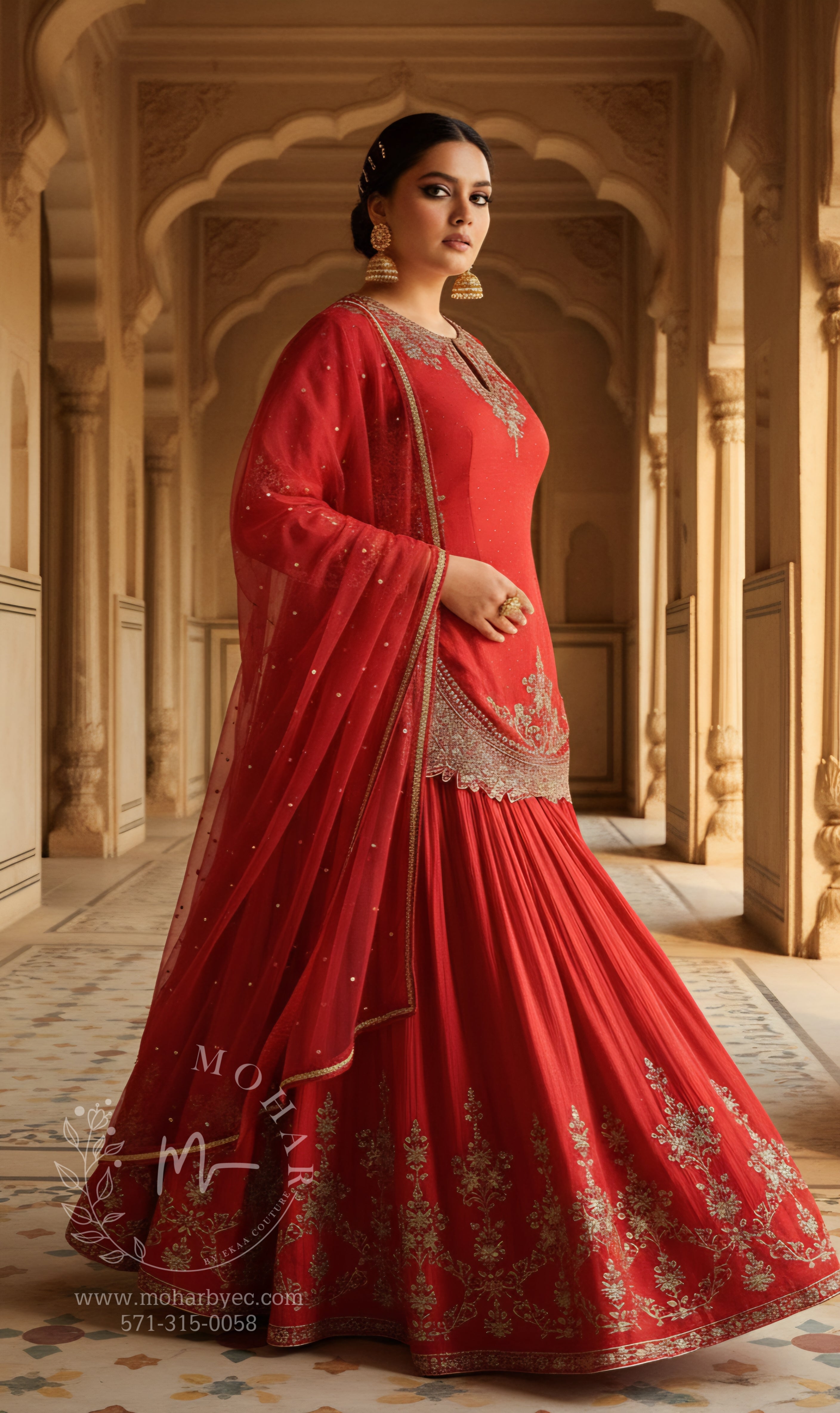 Make a grand entrance in this magnificent red sharara ensemble that beautifully blends traditional artistry with contemporary elegance. This exquisite three-piece set showcases intricate golden embroidery and delicate mirror work, creating a look that's both timeless and captivating.