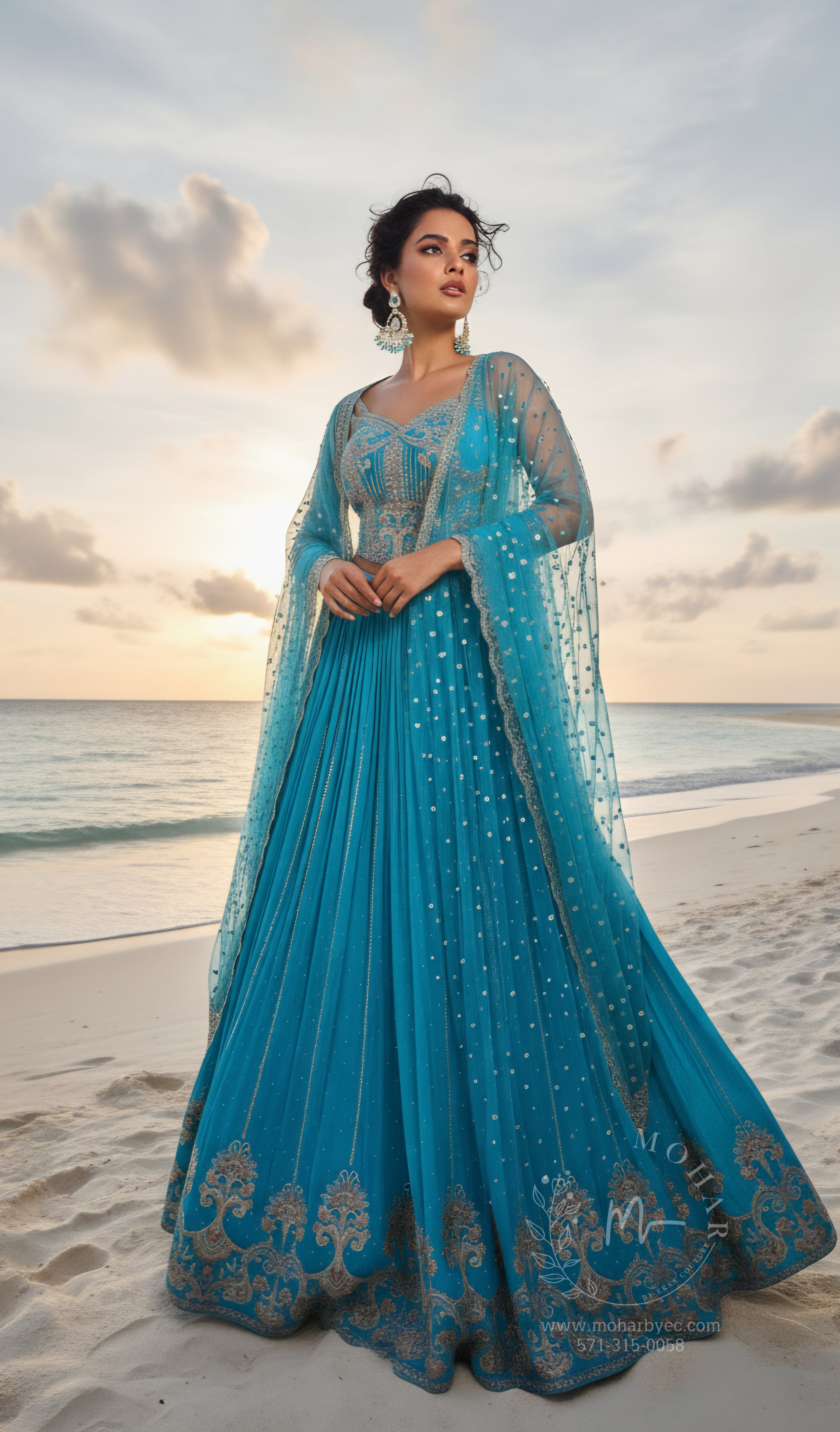 The pleated lehenga skirt flows gracefully to create a princess-like silhouette, while the shimmering embellishments create a celestial effect. The combination of turquoise blue with silver and gold accents makes this piece truly unforgettable.